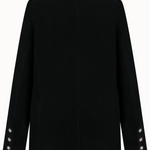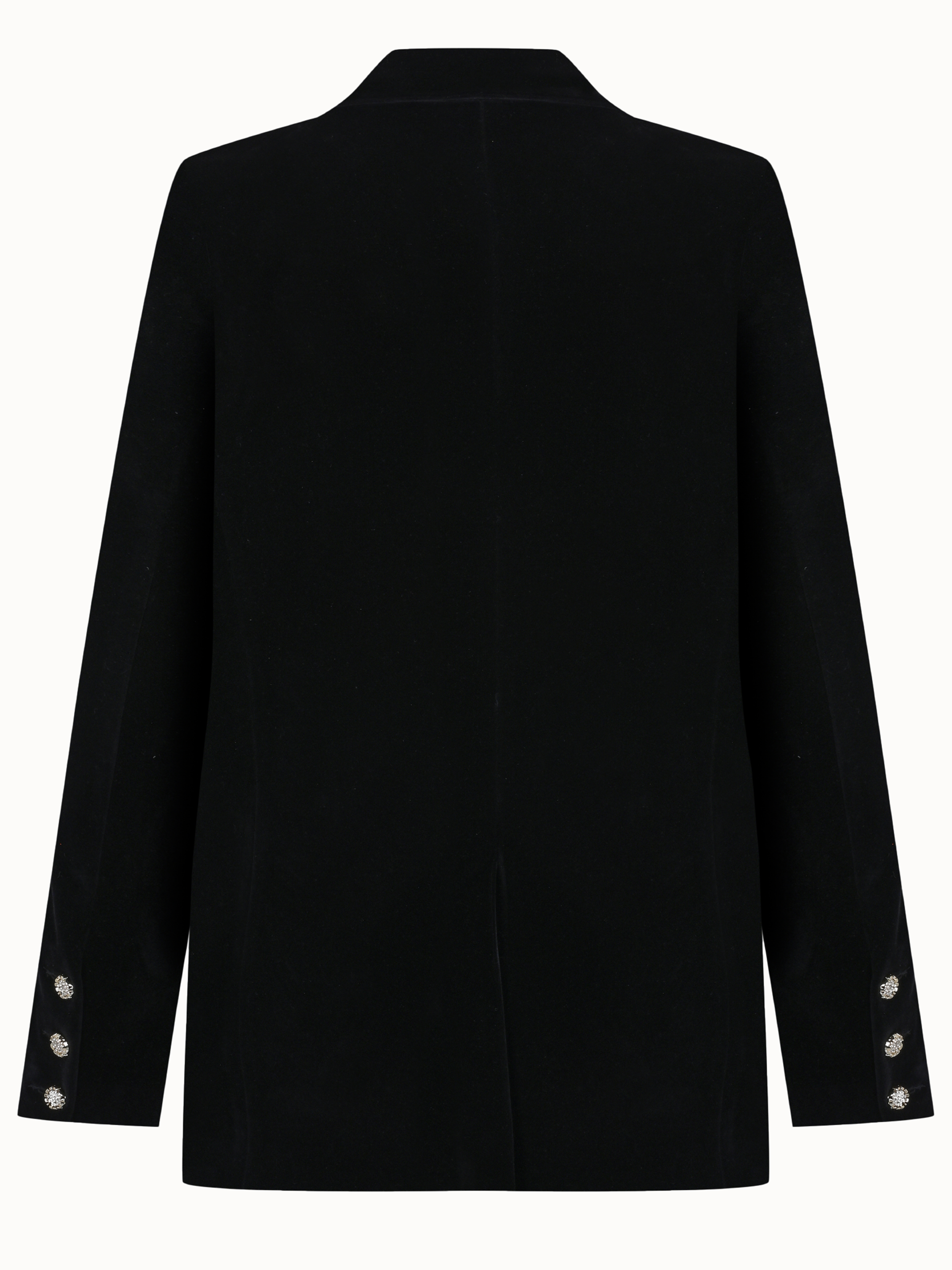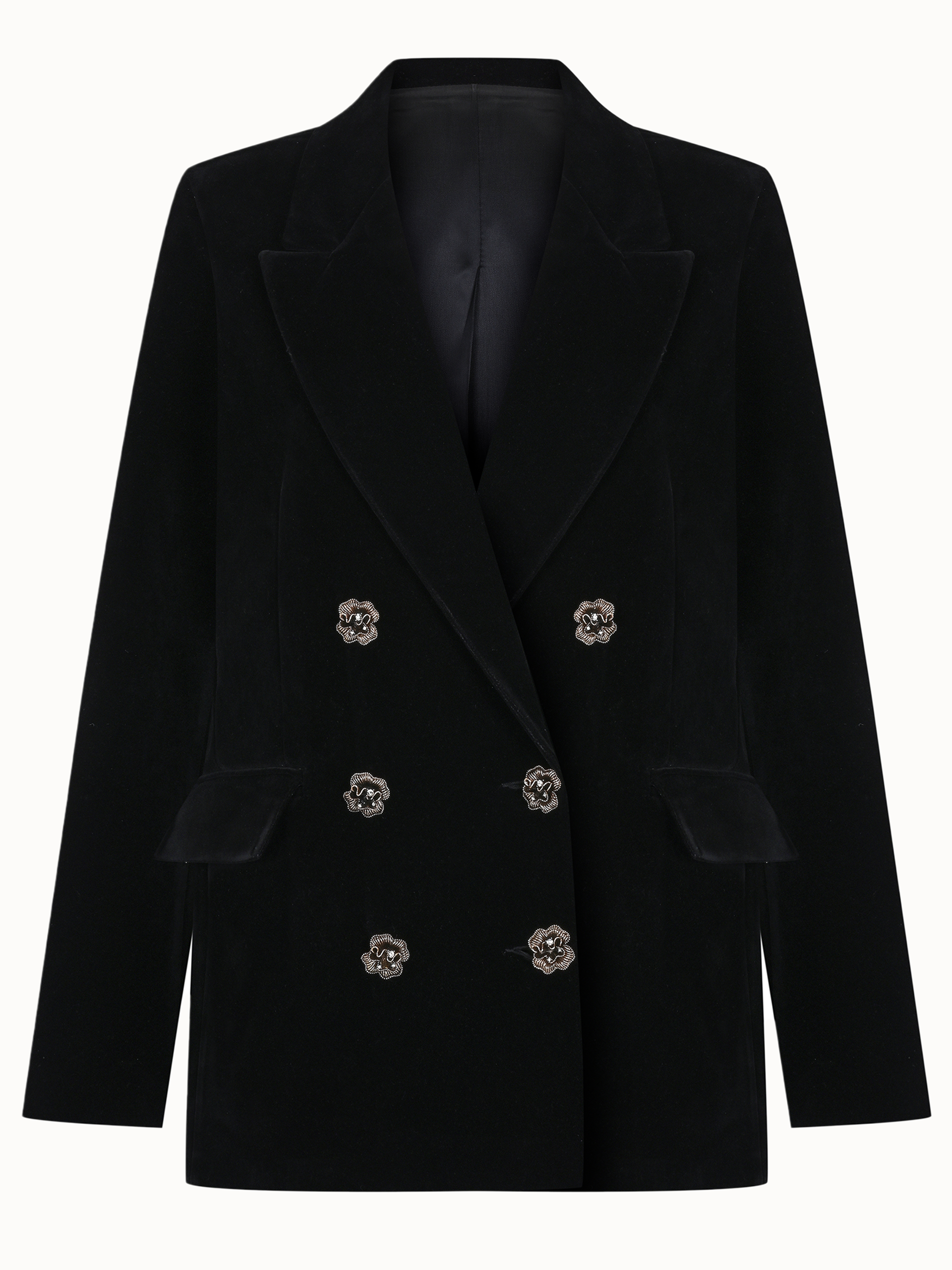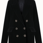 Crafted from black velvet, this double-breasted blazer stands out with its elegant flower-shaped buttons and sharp, tailored silhouette. Featuring wide lapels and front flap pockets, it offers a timeless balance between classic sophistication and modern style. Perfectly versatile, it pairs effortlessly with trousers, skirts, or dresses.